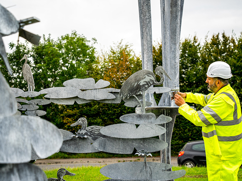 The sculpture depicts an infinity of lily pads, with a whole range of wildfowl and birds living amongst it, creating its own sanctuary. Raising awareness and reminding us how beautiful nature is around us and why we need to protect it.”