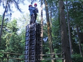 On to the next challenge – the ‘Pole’. The pole was about twenty feet high with a two foot square platform on the top and the objective was to climb to the top and stand up. Again the young blood opted to go first and during their ascent they had to put blocks in the slots above to make footings as they climbed. Once at the top they stood up, held hands and leaned back in opposite directions before letting go of each other and falling to the ground backwards – well they didn’t fall actually did they, as they were attached to the safety ropes!